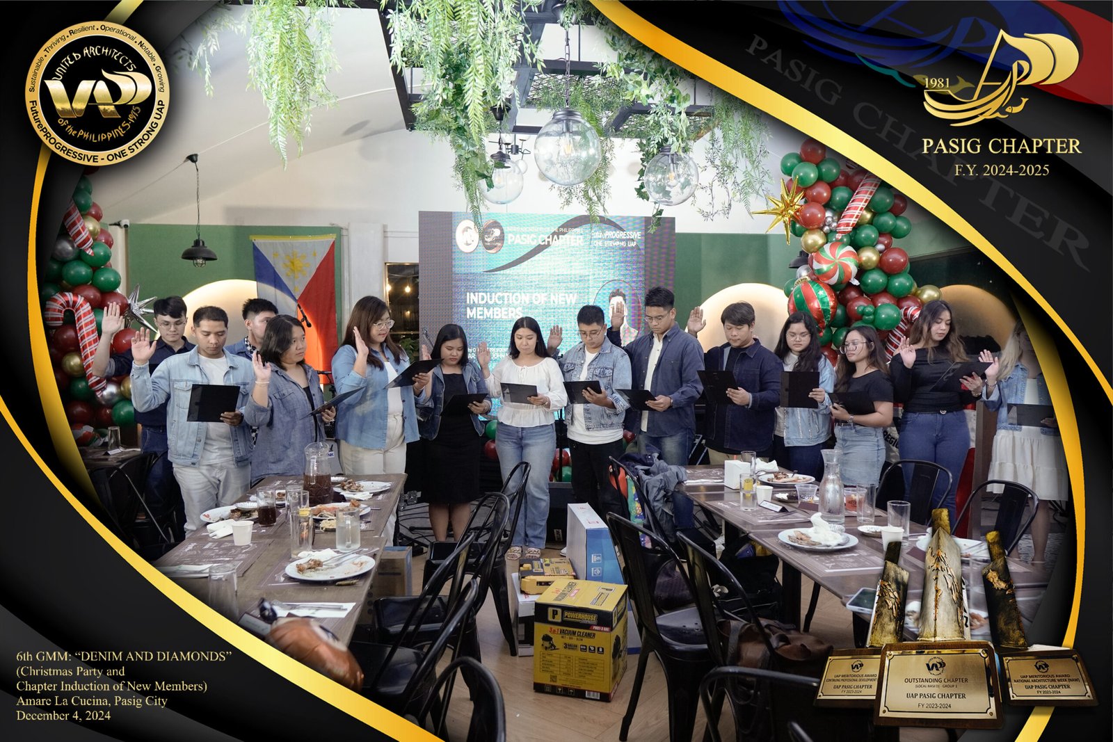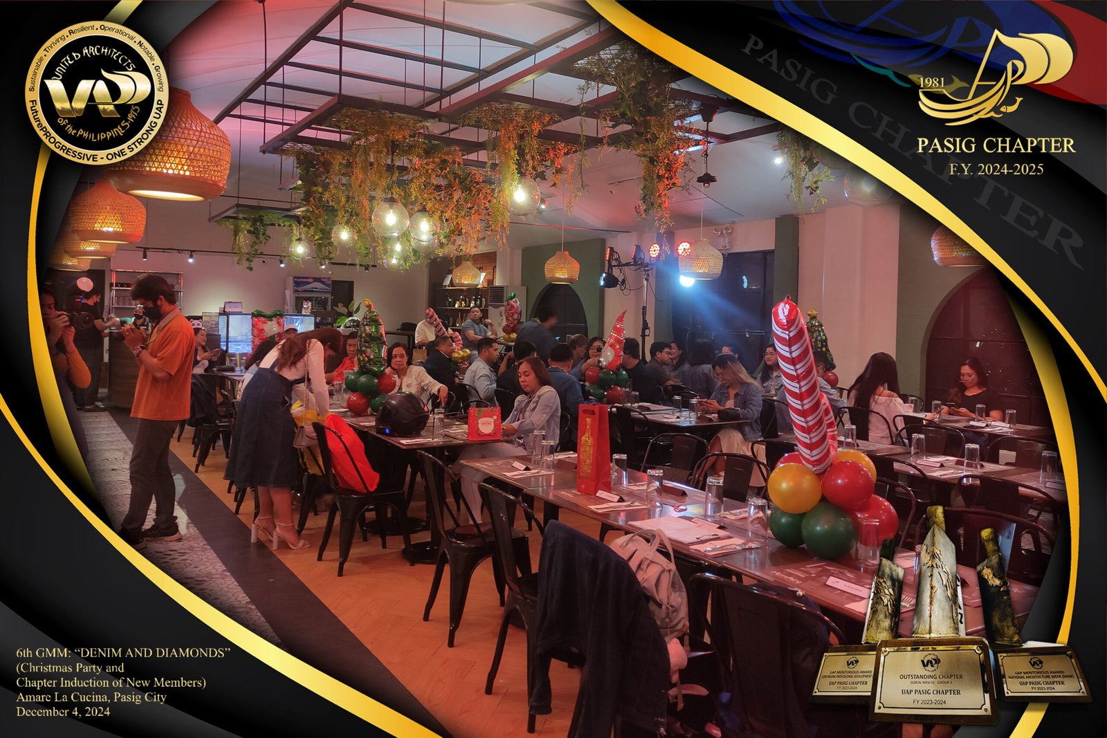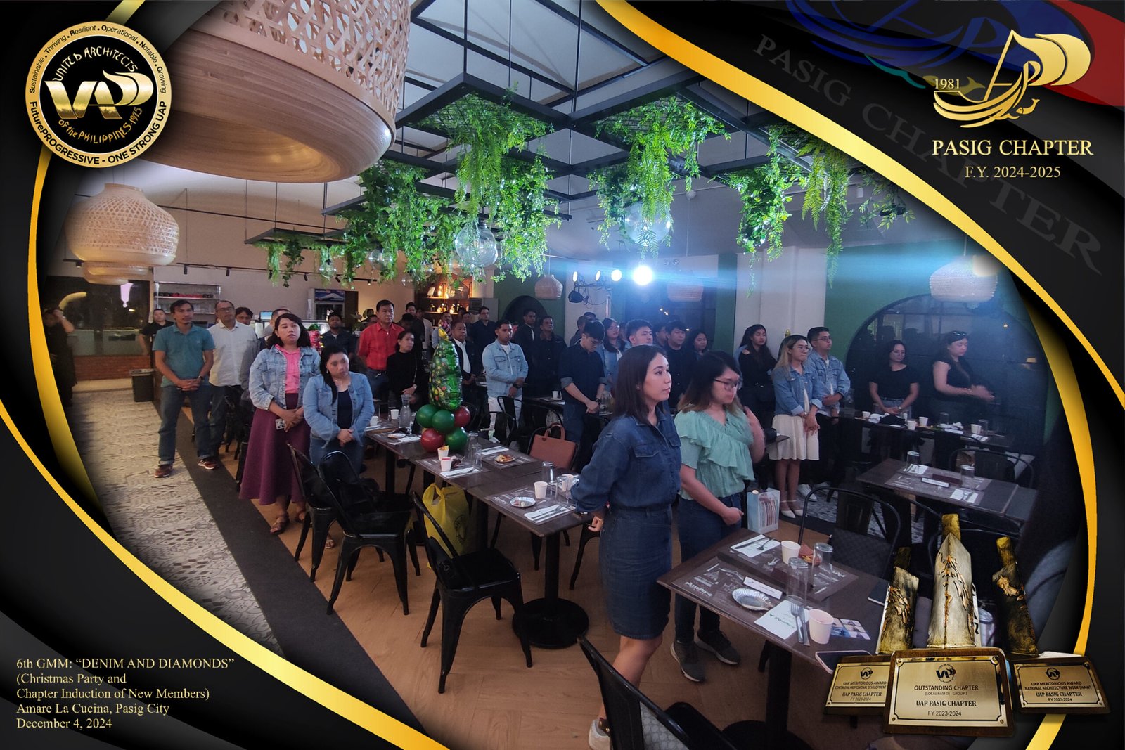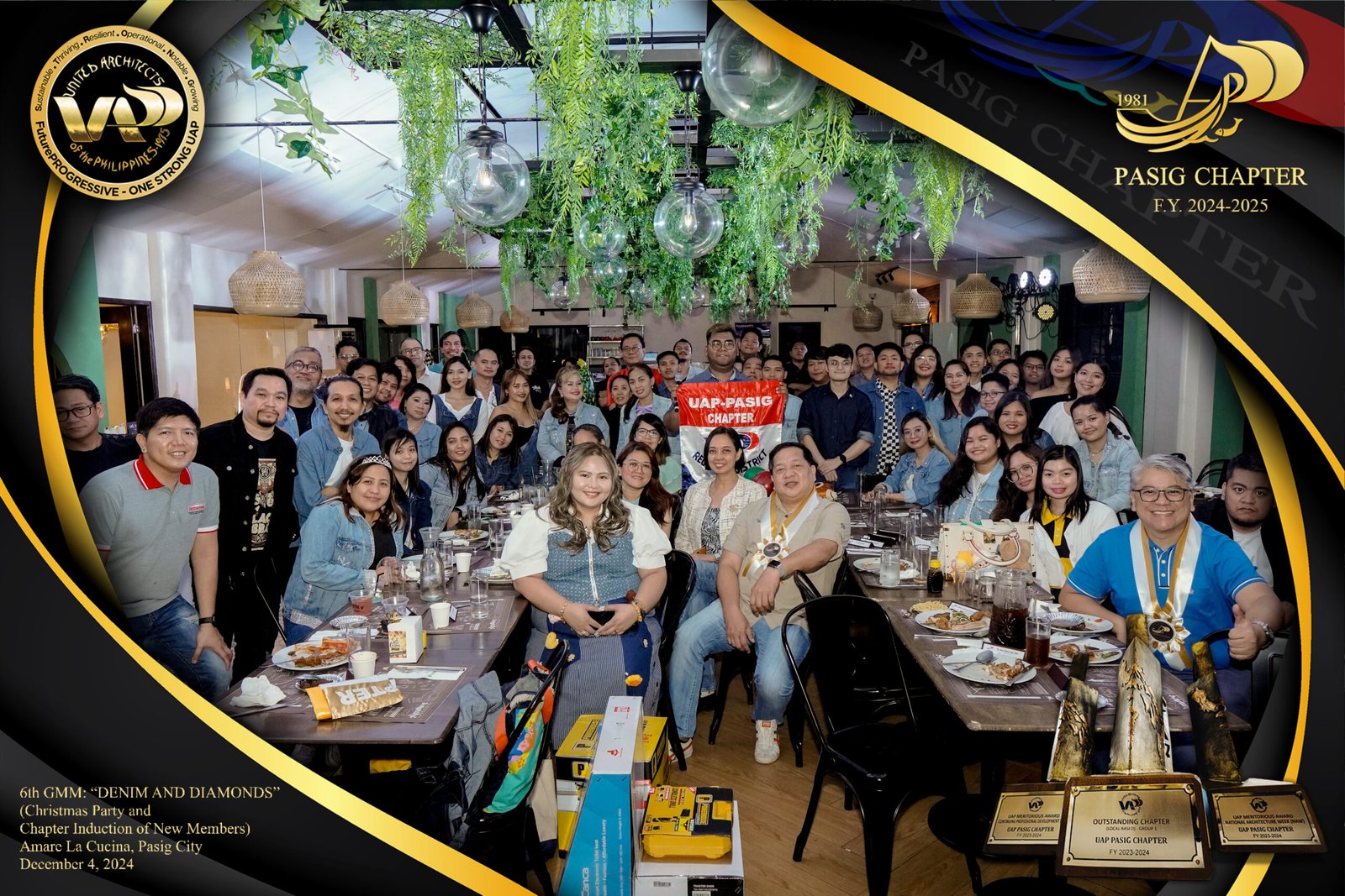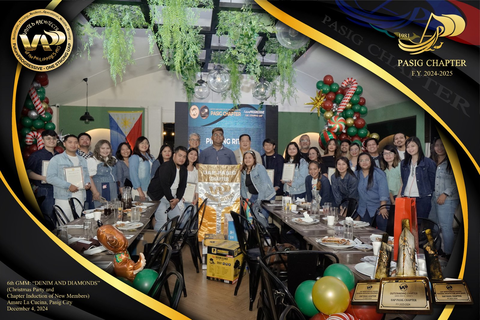 The UAP Pasig Chapter recently concluded its 6th General Membership Meeting (F.Y. 2024-2025) with a festive gathering themed “Denim and Diamonds” on December 4, 2024. Held at Amare La Cucina in Pasig City, the event served as both a vibrant Christmas party and induction ceremony for the chapter’s newest members. The evening was filled with camaraderie and celebration, reflecting the chapter’s commitment to fostering a strong and supportive community within the architectural profession.