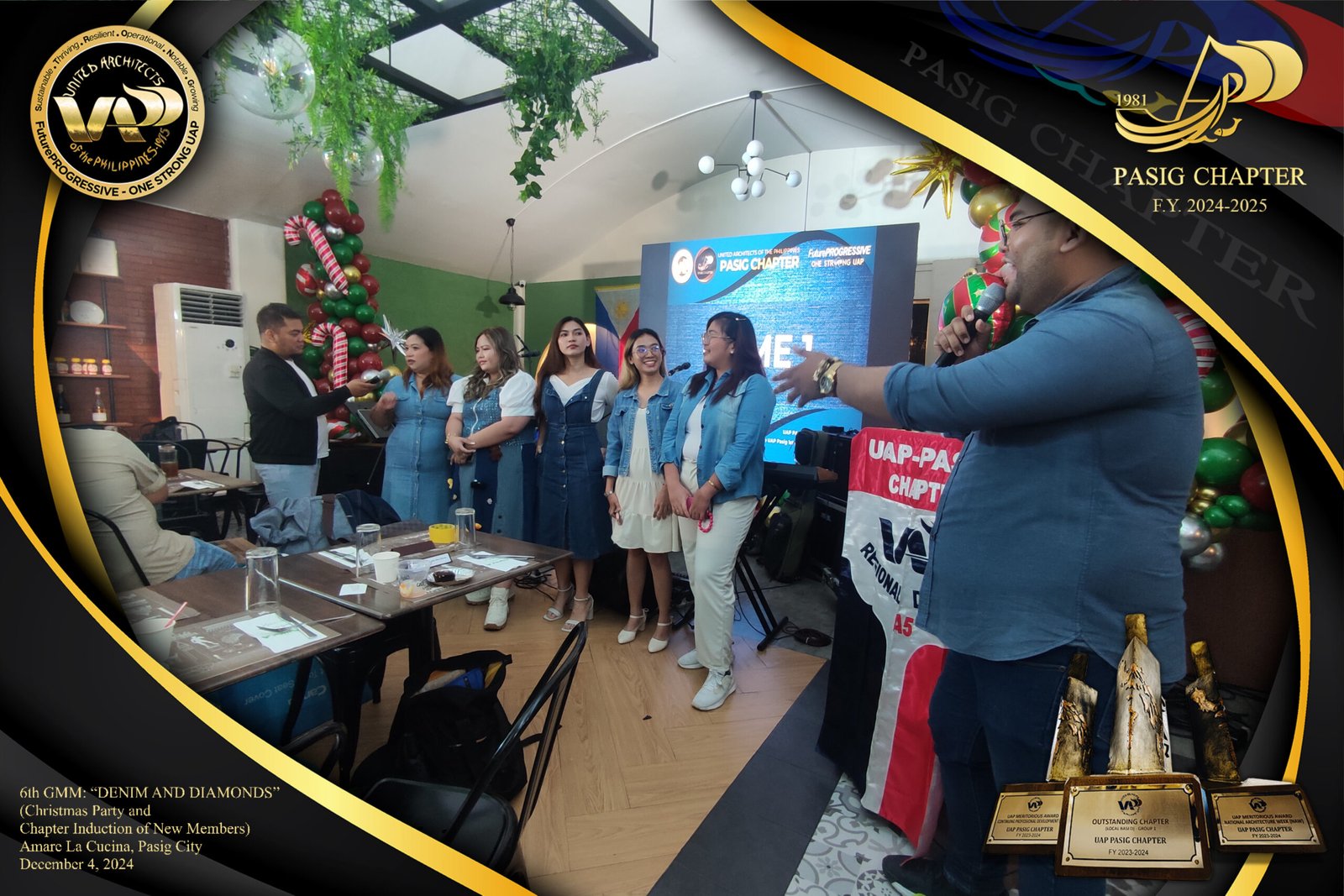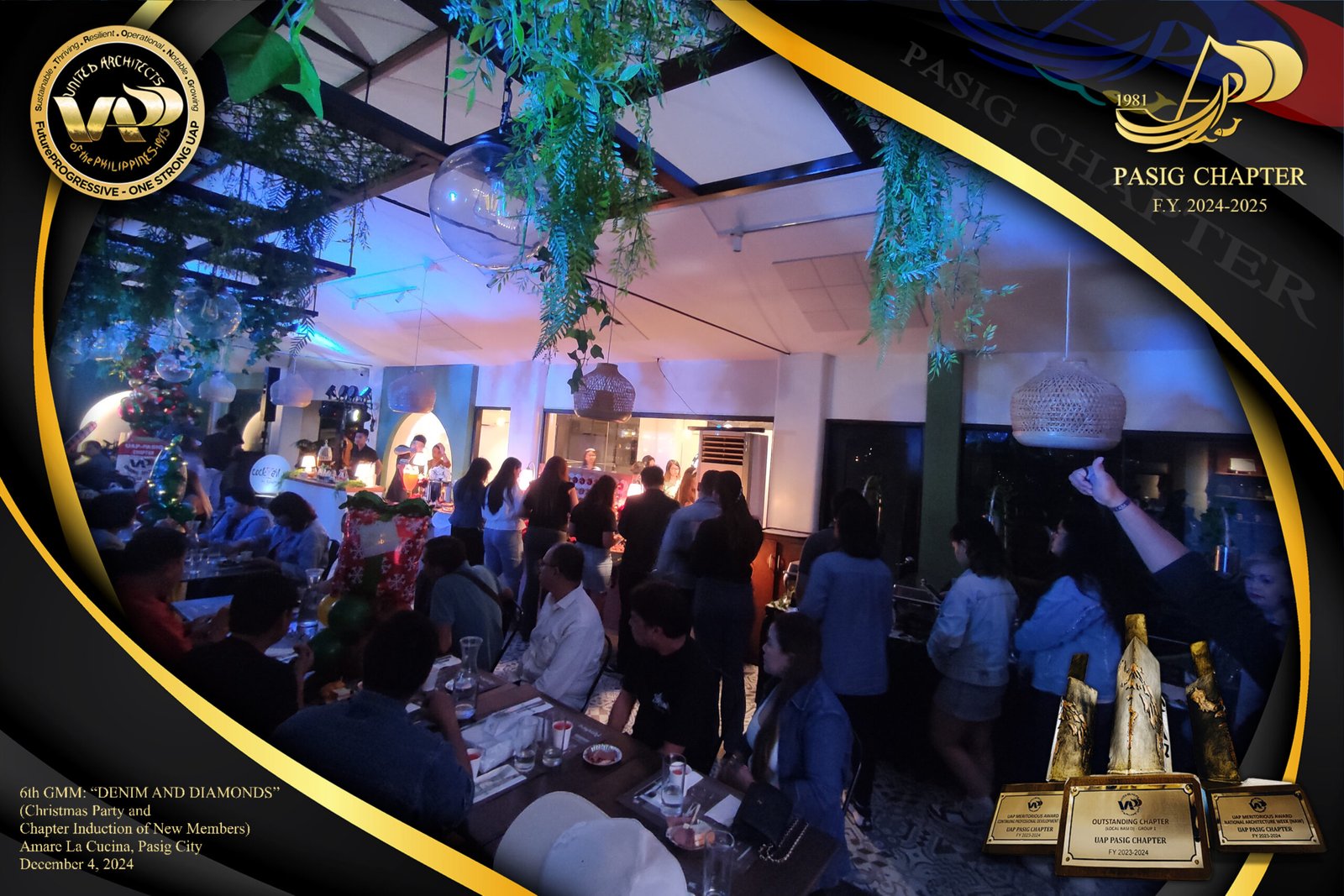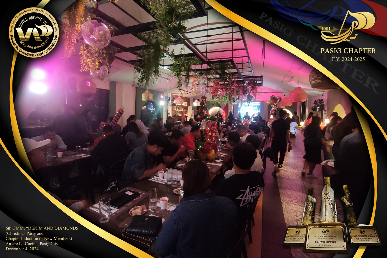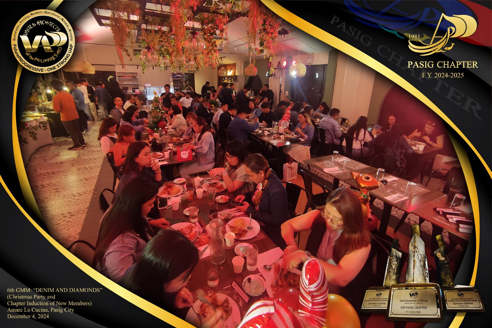 The UAP Pasig Chapter recently concluded its 6th General Membership Meeting (F.Y. 2024-2025) with a festive gathering themed “Denim and Diamonds” on December 4, 2024. Held at Amare La Cucina in Pasig City, the event served as both a vibrant Christmas party and induction ceremony for the chapter’s newest members. The evening was filled with camaraderie and celebration, reflecting the chapter’s commitment to fostering a strong and supportive community within the architectural profession.