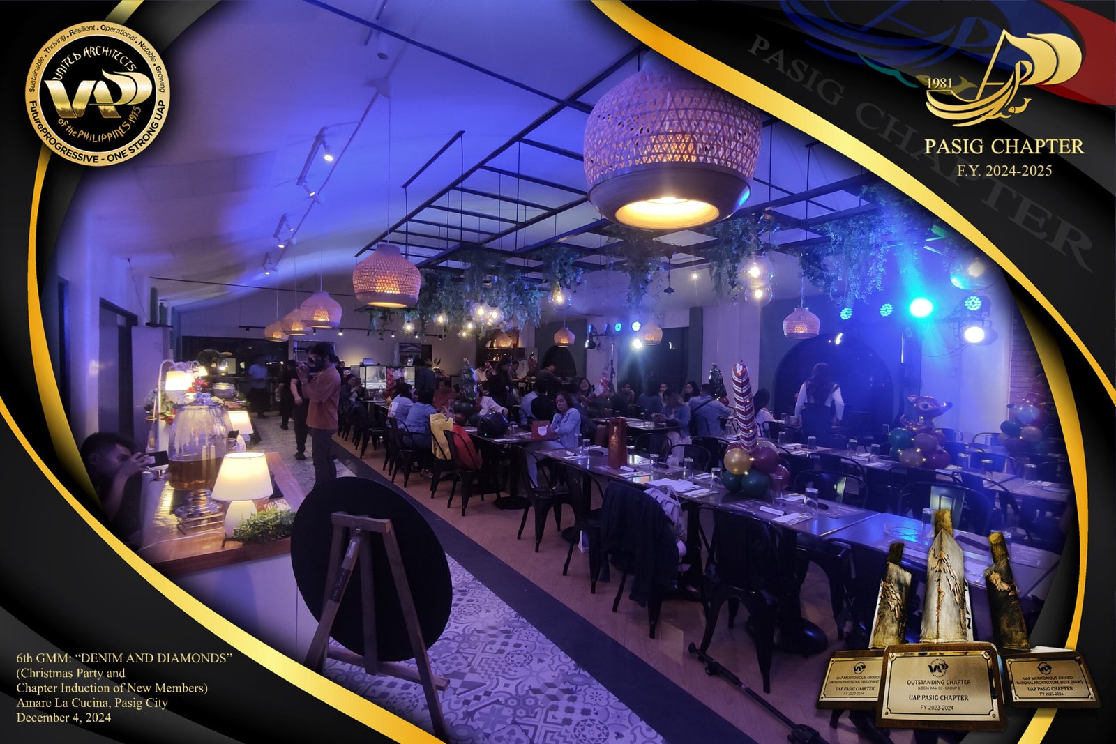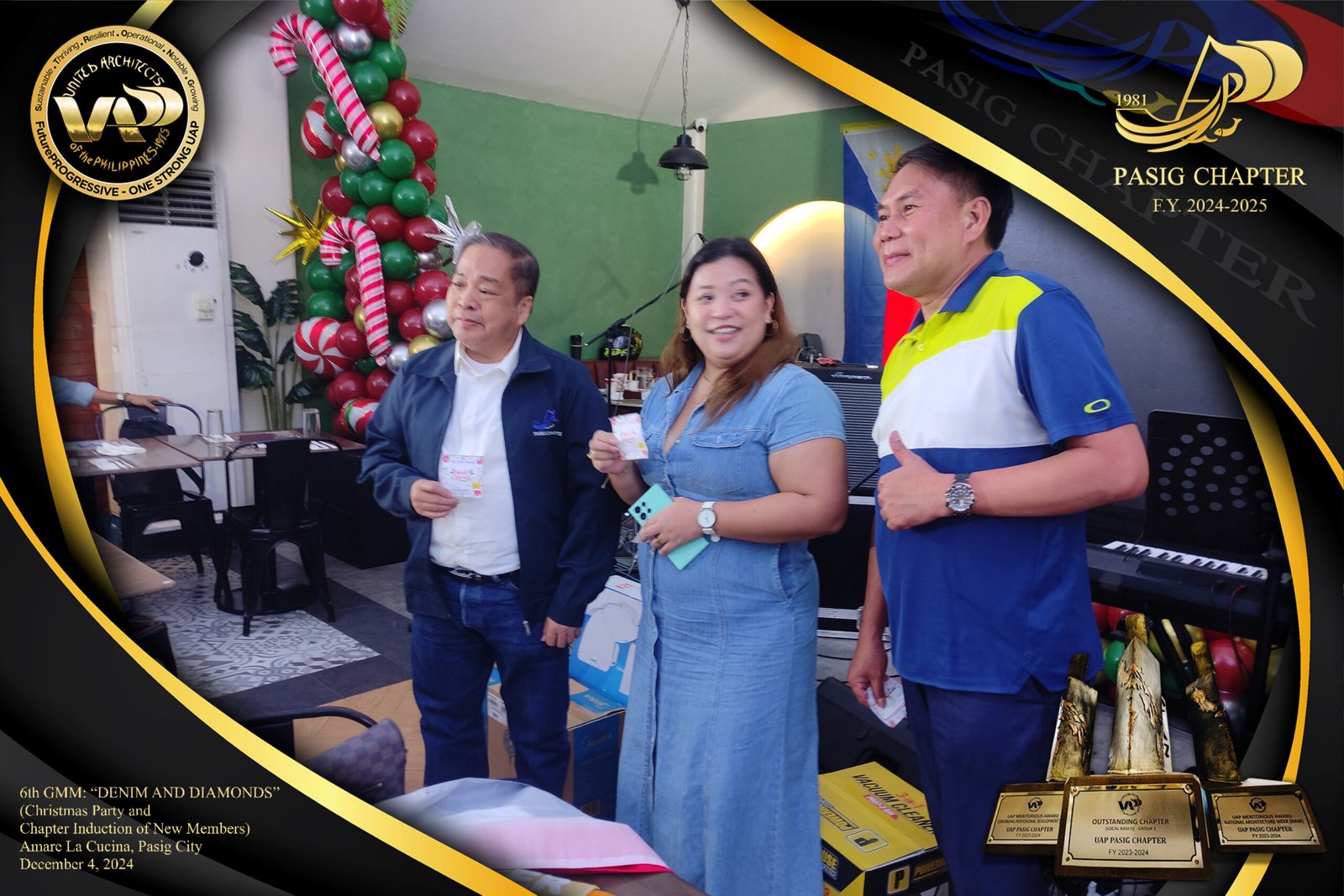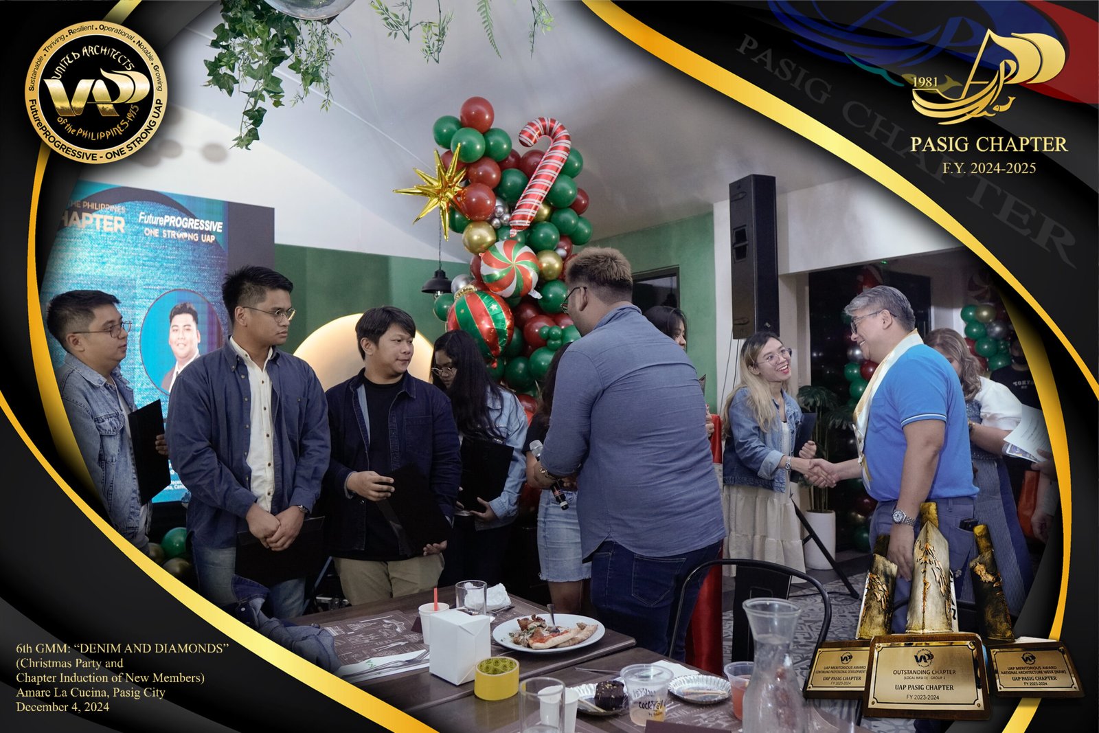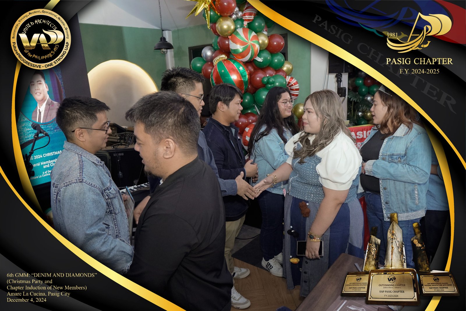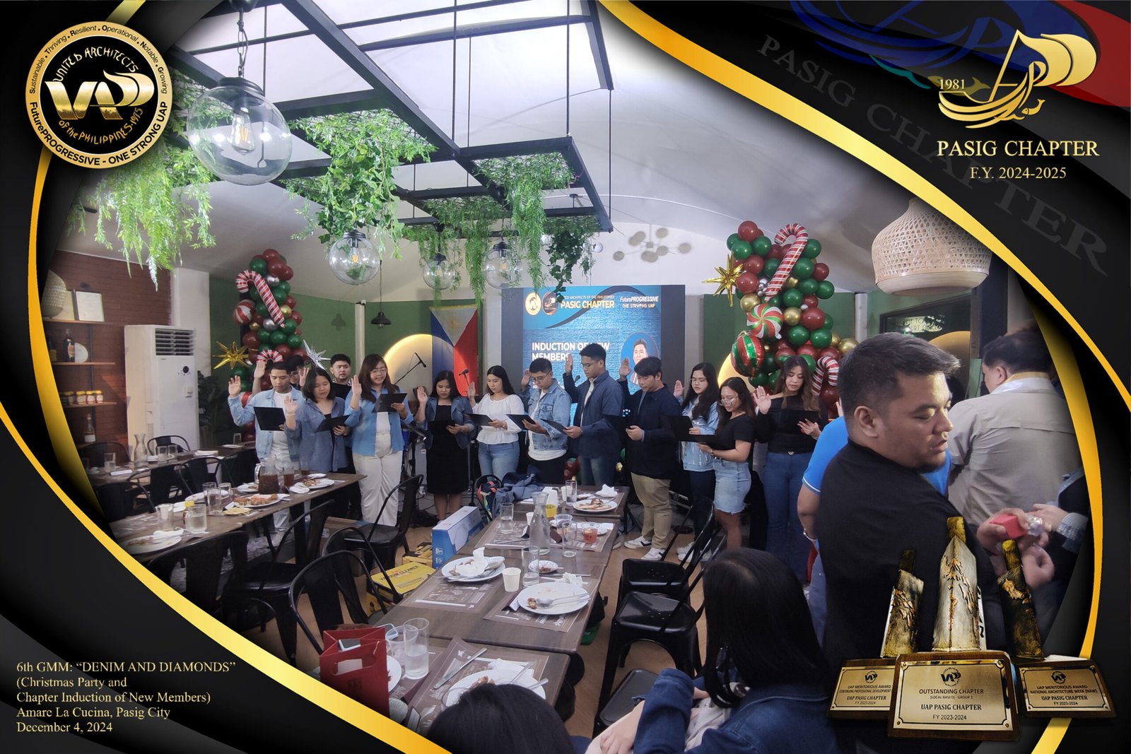The UAP Pasig Chapter recently concluded its 6th General Membership Meeting (F.Y. 2024-2025) with a festive gathering themed “Denim and Diamonds” on December 4, 2024. Held at Amare La Cucina in Pasig City, the event served as both a vibrant Christmas party and induction ceremony for the chapter’s newest members. The evening was filled with camaraderie and celebration, reflecting the chapter’s commitment to fostering a strong and supportive community within the architectural profession.