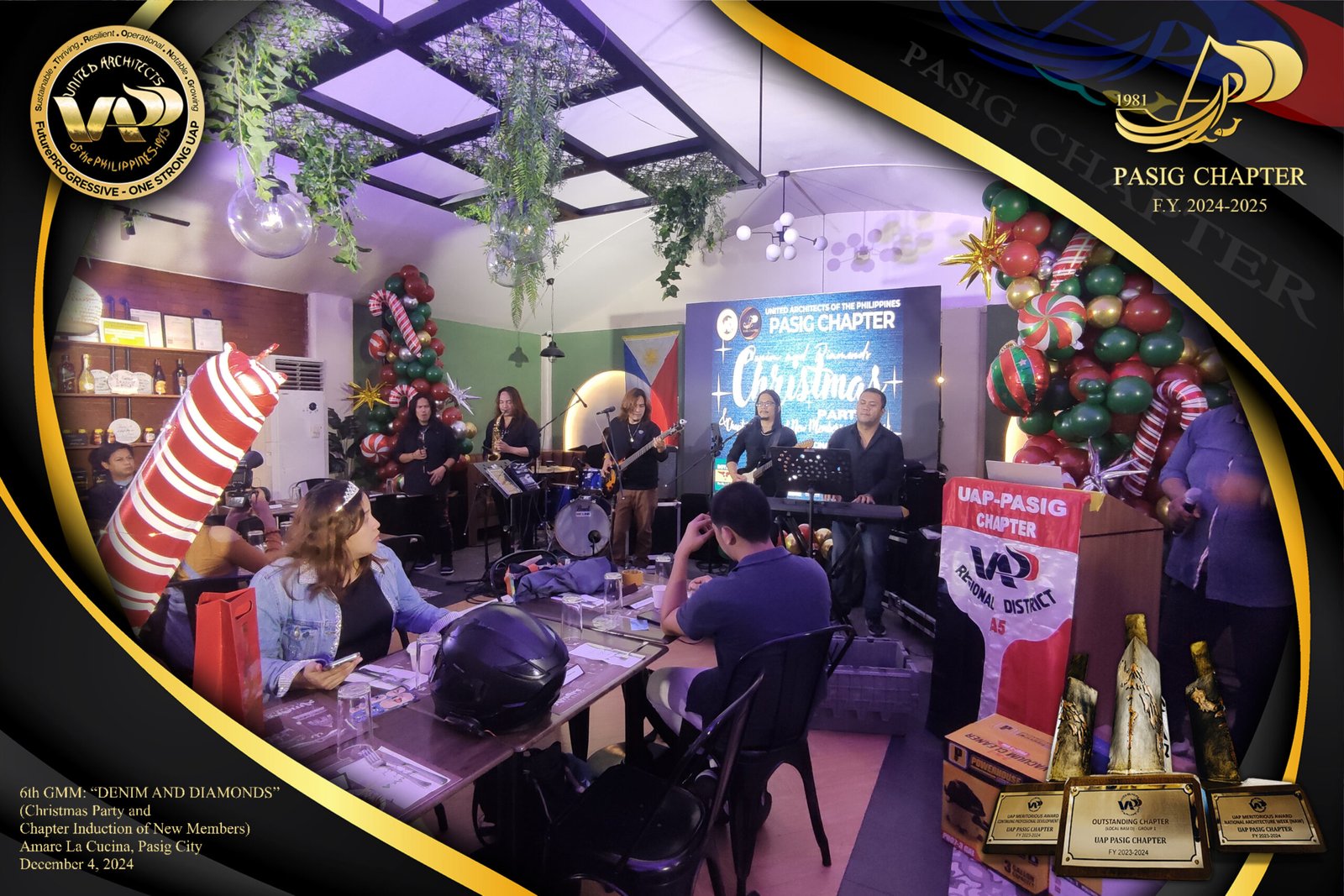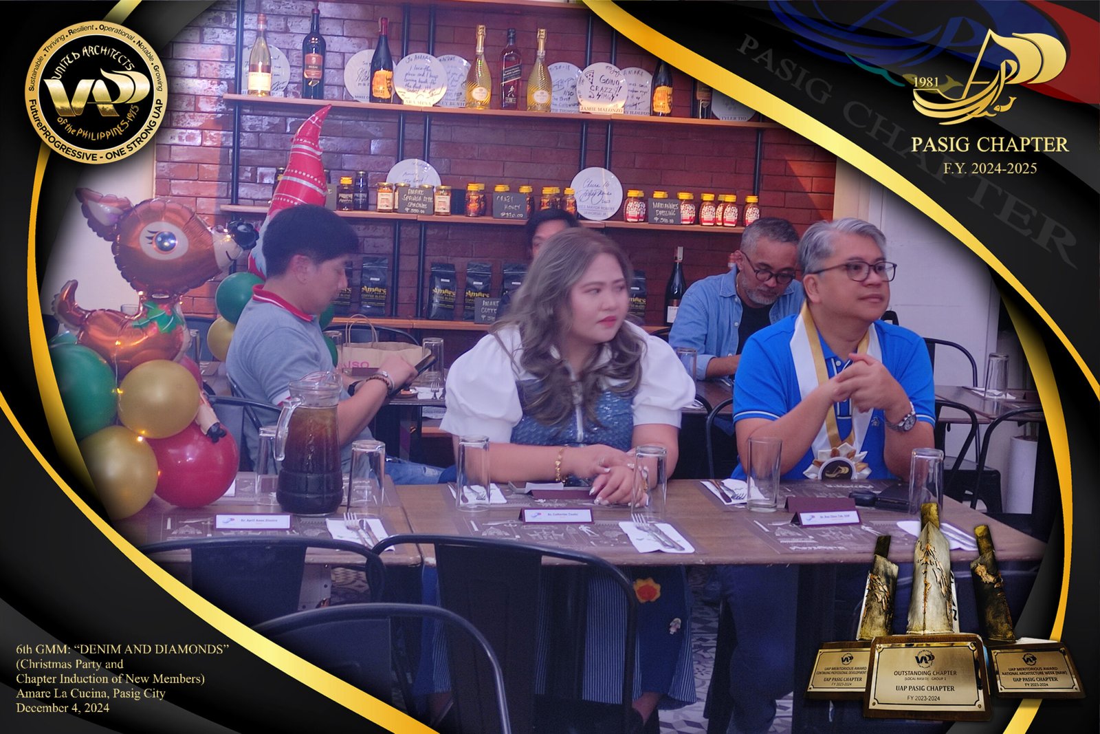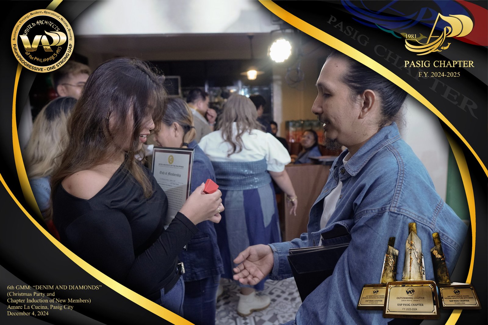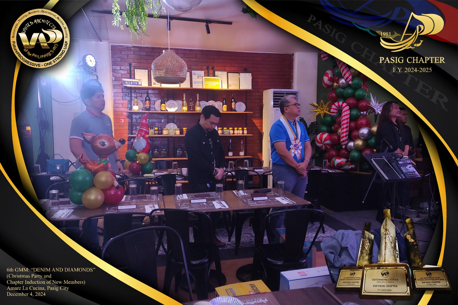 The UAP Pasig Chapter recently concluded its 6th General Membership Meeting (F.Y. 2024-2025) with a festive gathering themed “Denim and Diamonds” on December 4, 2024. Held at Amare La Cucina in Pasig City, the event served as both a vibrant Christmas party and induction ceremony for the chapter’s newest members. The evening was filled with camaraderie and celebration, reflecting the chapter’s commitment to fostering a strong and supportive community within the architectural profession.