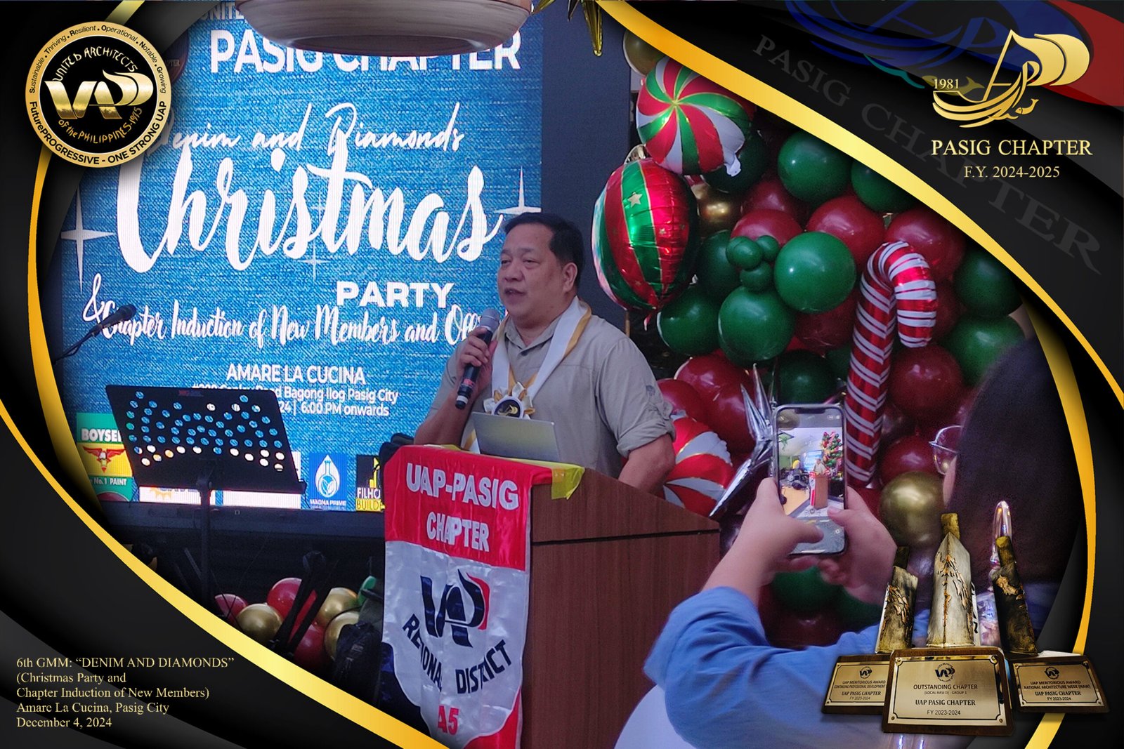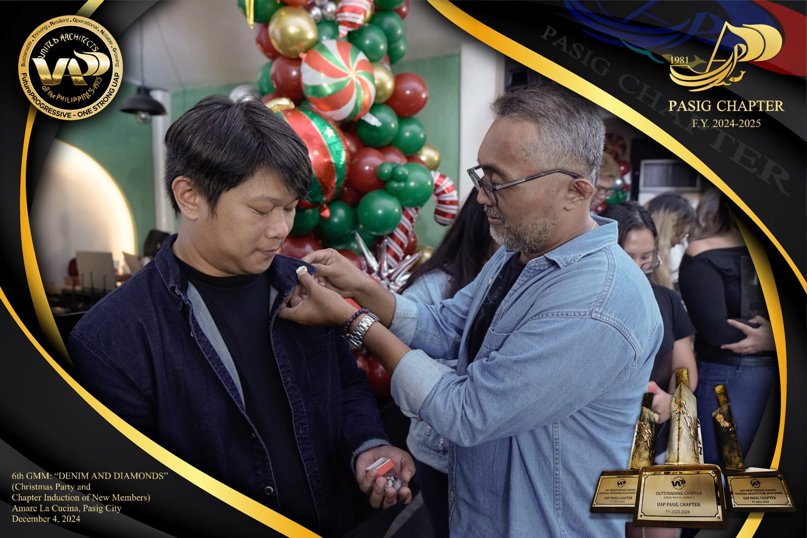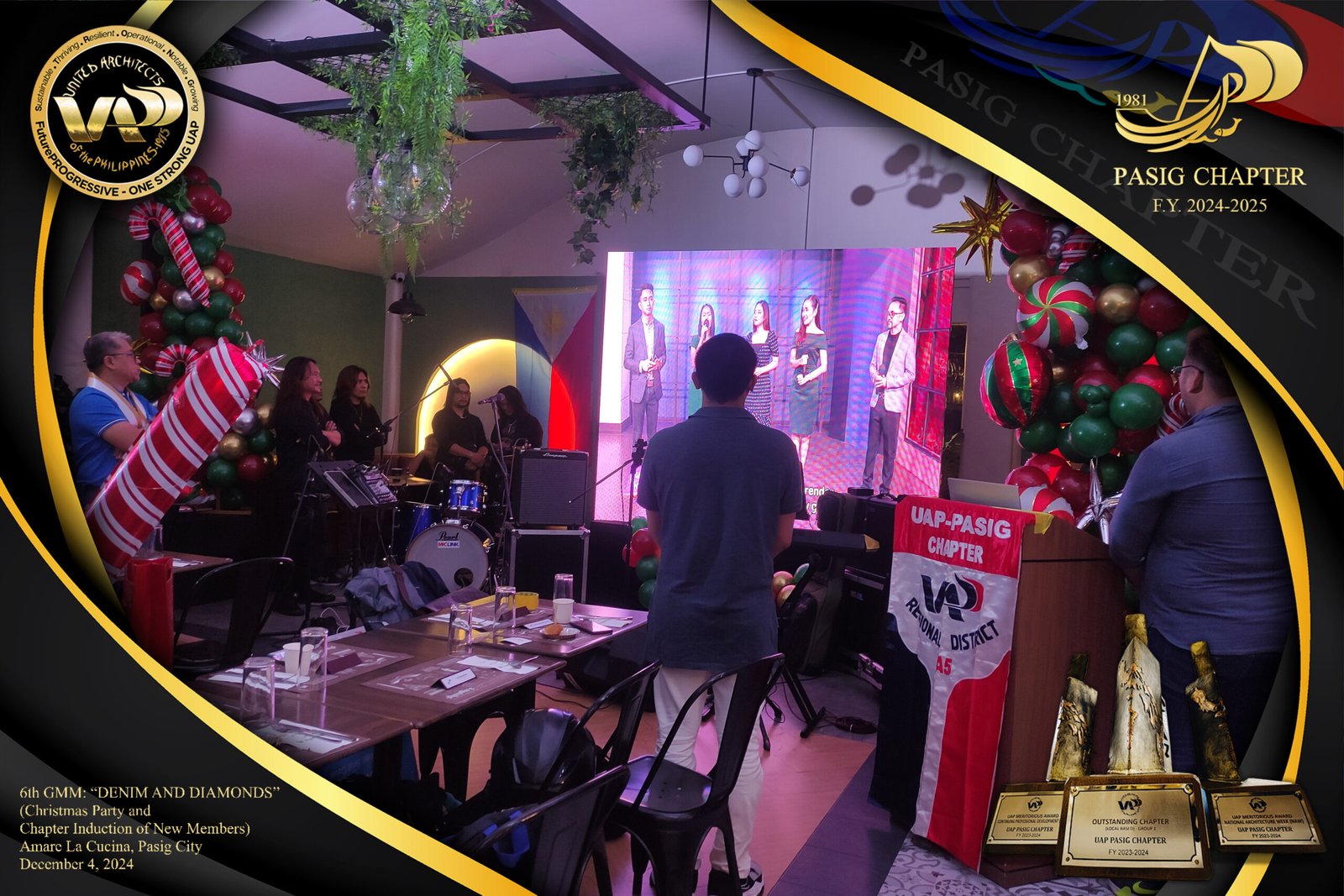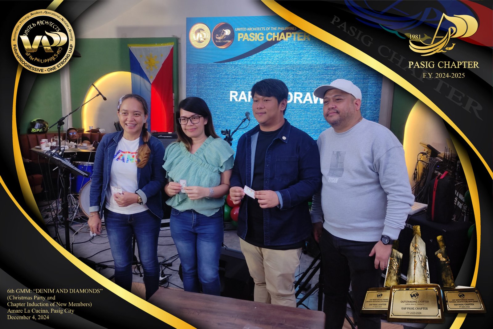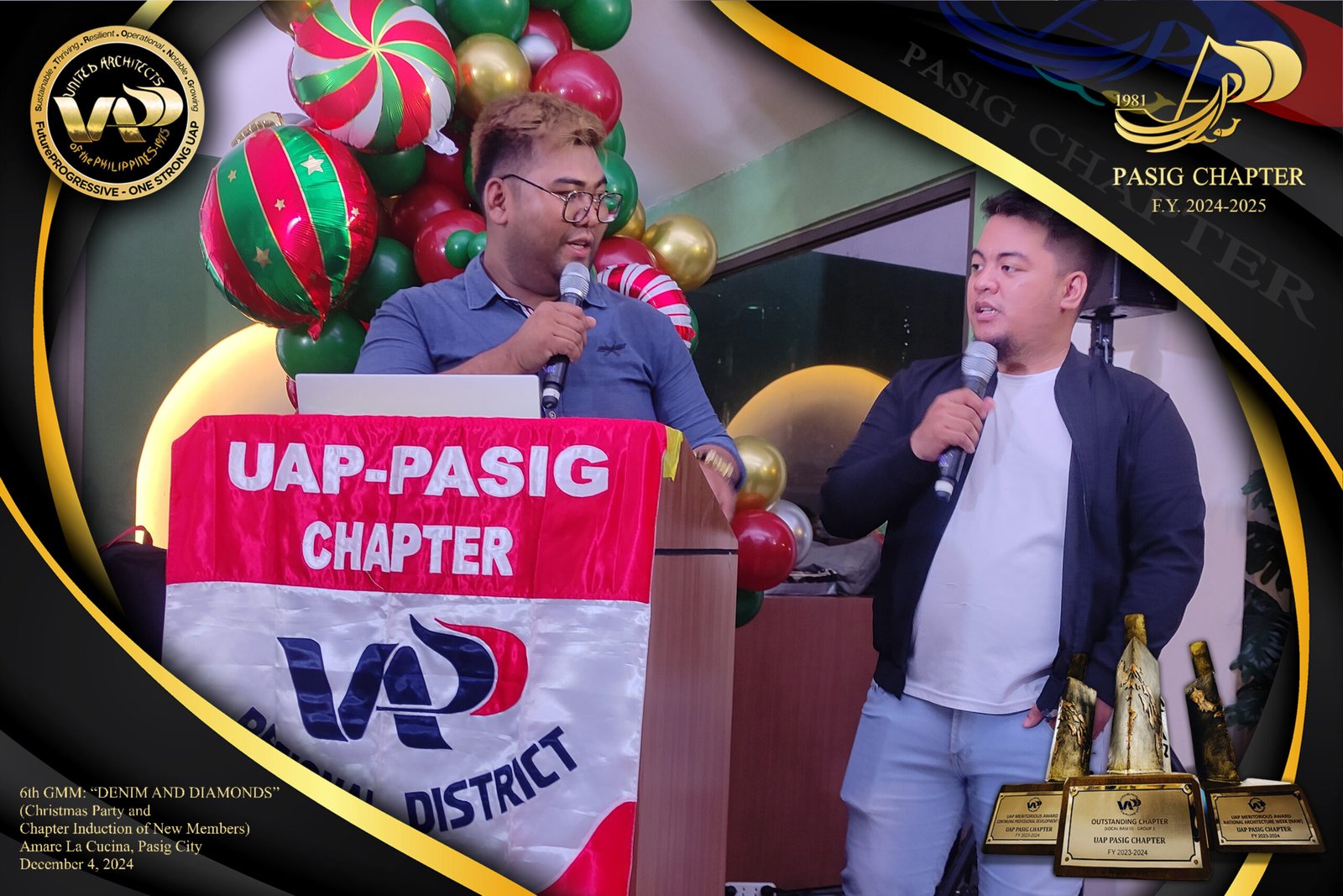 The UAP Pasig Chapter recently concluded its 6th General Membership Meeting (F.Y. 2024-2025) with a festive gathering themed “Denim and Diamonds” on December 4, 2024. Held at Amare La Cucina in Pasig City, the event served as both a vibrant Christmas party and induction ceremony for the chapter’s newest members. The evening was filled with camaraderie and celebration, reflecting the chapter’s commitment to fostering a strong and supportive community within the architectural profession.