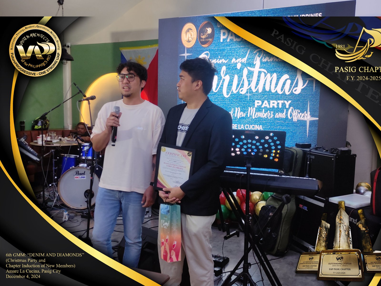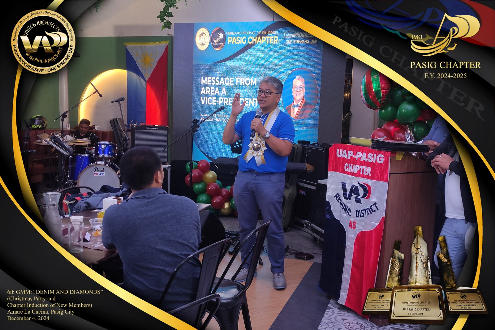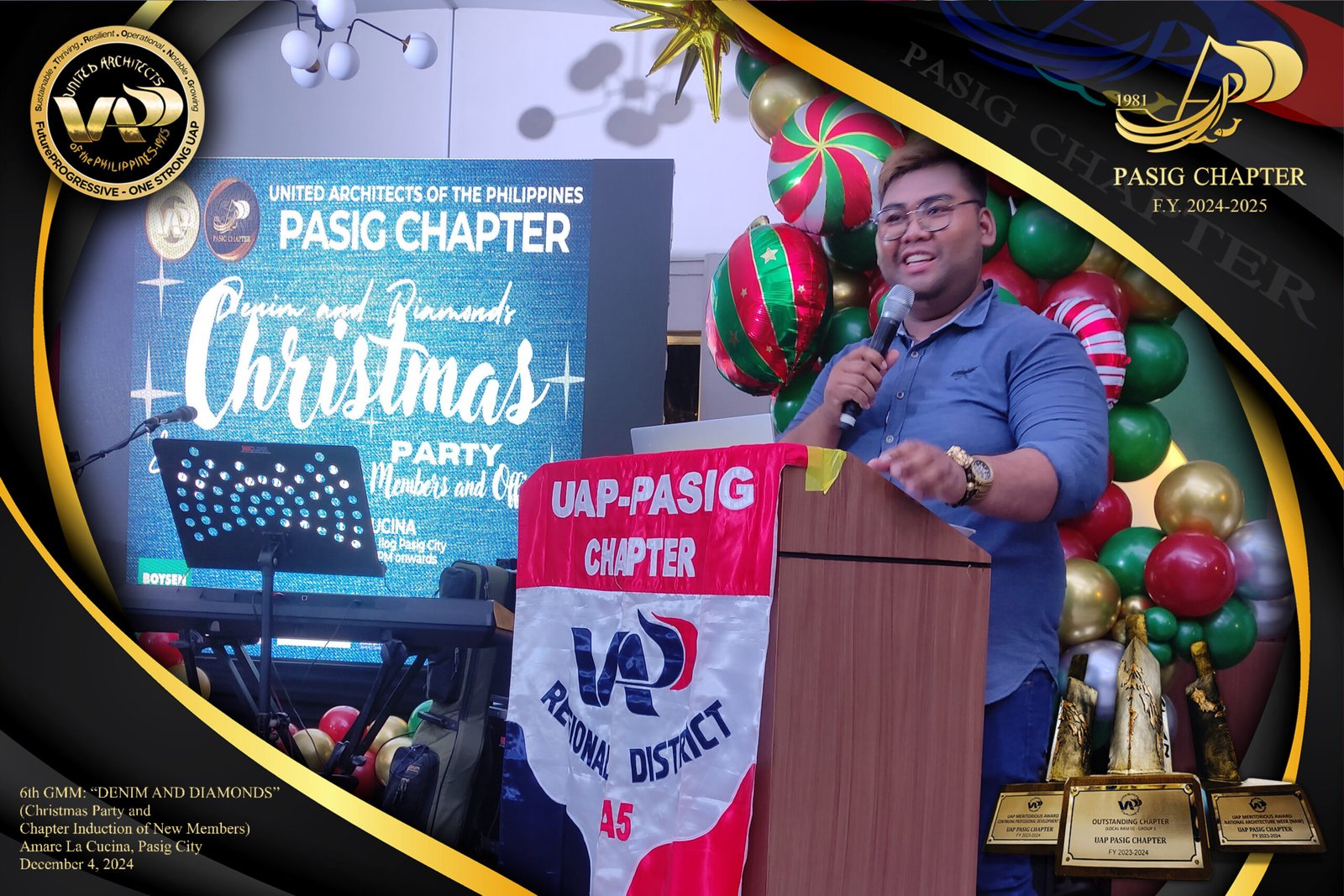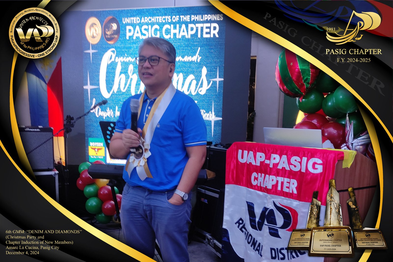 The UAP Pasig Chapter recently concluded its 6th General Membership Meeting (F.Y. 2024-2025) with a festive gathering themed “Denim and Diamonds” on December 4, 2024. Held at Amare La Cucina in Pasig City, the event served as both a vibrant Christmas party and induction ceremony for the chapter’s newest members. The evening was filled with camaraderie and celebration, reflecting the chapter’s commitment to fostering a strong and supportive community within the architectural profession.