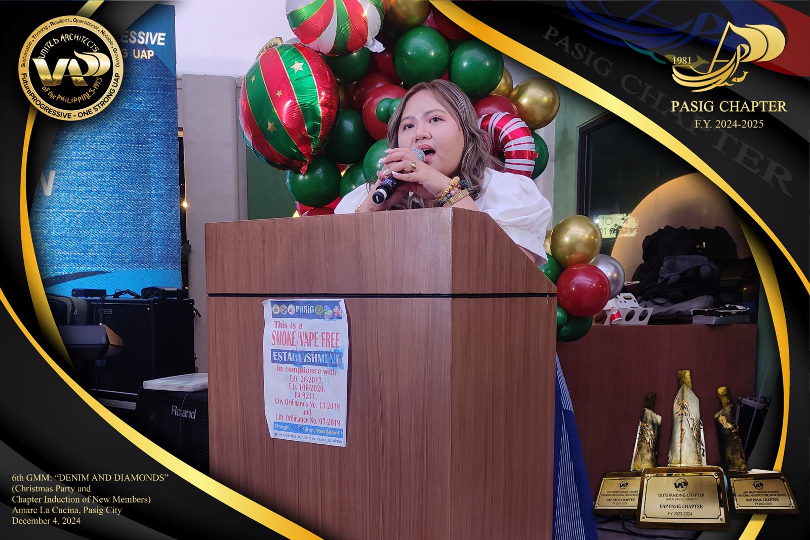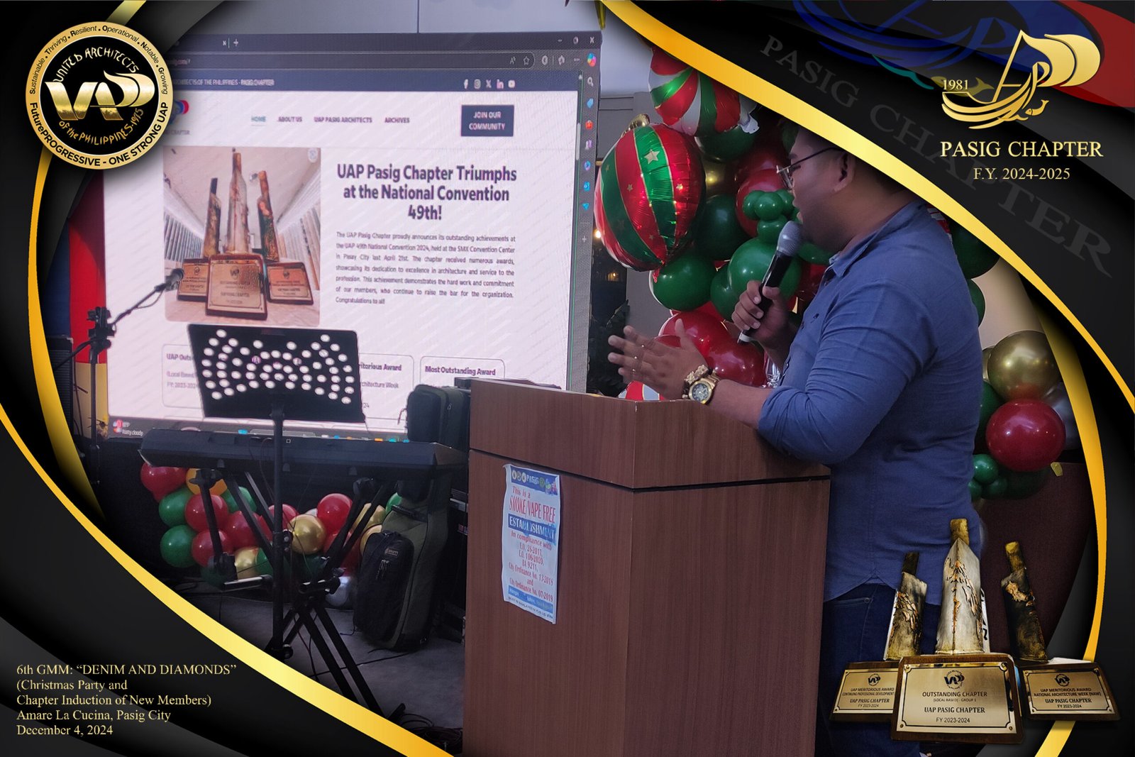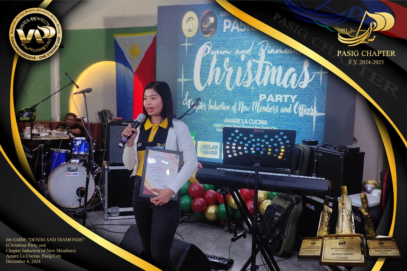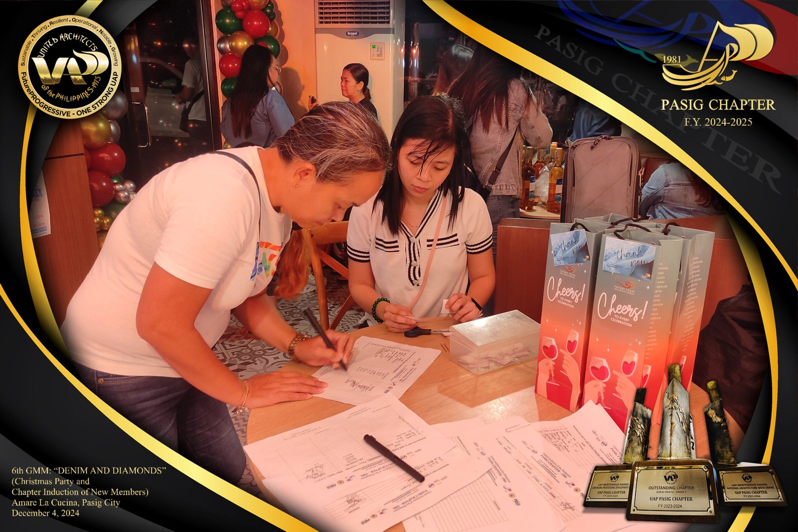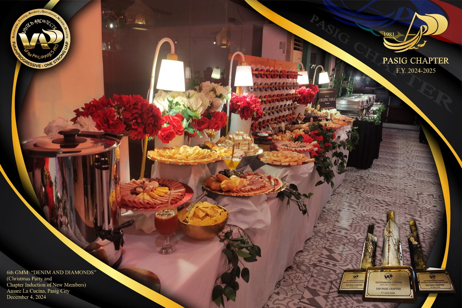 The UAP Pasig Chapter recently concluded its 6th General Membership Meeting (F.Y. 2024-2025) with a festive gathering themed “Denim and Diamonds” on December 4, 2024. Held at Amare La Cucina in Pasig City, the event served as both a vibrant Christmas party and induction ceremony for the chapter’s newest members. The evening was filled with camaraderie and celebration, reflecting the chapter’s commitment to fostering a strong and supportive community within the architectural profession.