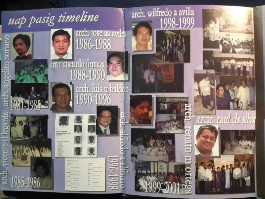Thus, the University of Life Chapter was conceived in the first week of April 1981. All “at-large” architects of the Ministry of Human Settlements — Urban and Rural Bliss, Human Settlements Development Corporation, HUDCC, and other MHS affiliates, ESGI, Wecons (UL Project Managers), and some of the building contractors of the project — signed the charter papers. More than 21 architects signed the documents. On May 21, 1981, the University of Life Chapter was approved by the UAP National Board. At its first meeting on May 26, 1981, the body suggested affixing “Pasig” to its official name. The body also decided on that day the first officers of the chapter. Thus, in July 1981, at the UAP convention in Baguio City, the UL-Pasig Chapter was formally presented and the Charter Officers inducted into office by Ar. Leandro Losin, namely: Ar. Angelito S. Soriano (Charter President); Ar. Chiqui Legarda (Vice-President); Ar. Benjamin Chua (Secretary); Ar. Mario Rillo (Treasurer); Ar. Rodino G. Bernardo, Ar. Felix Costa, Jr., and Ar. Pedro Rarallo (Directors).